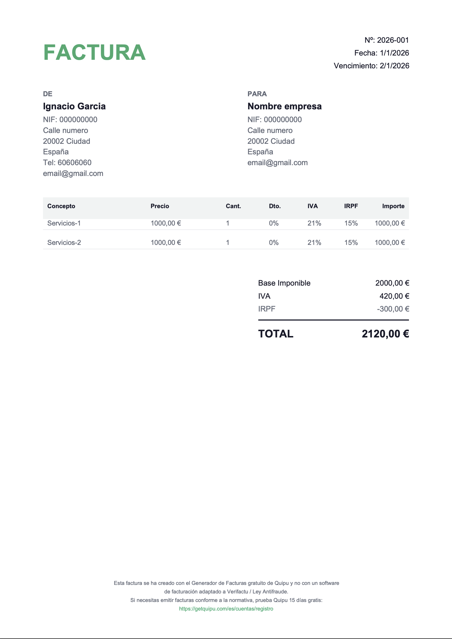 Retención de IRPF (si aplica): Si eres autónomo profesional facturando a otra empresa o autónomo, debes restar el porcentaje de IRPF correspondiente a tu situación censal. Ver tablas y tramos del IRPF