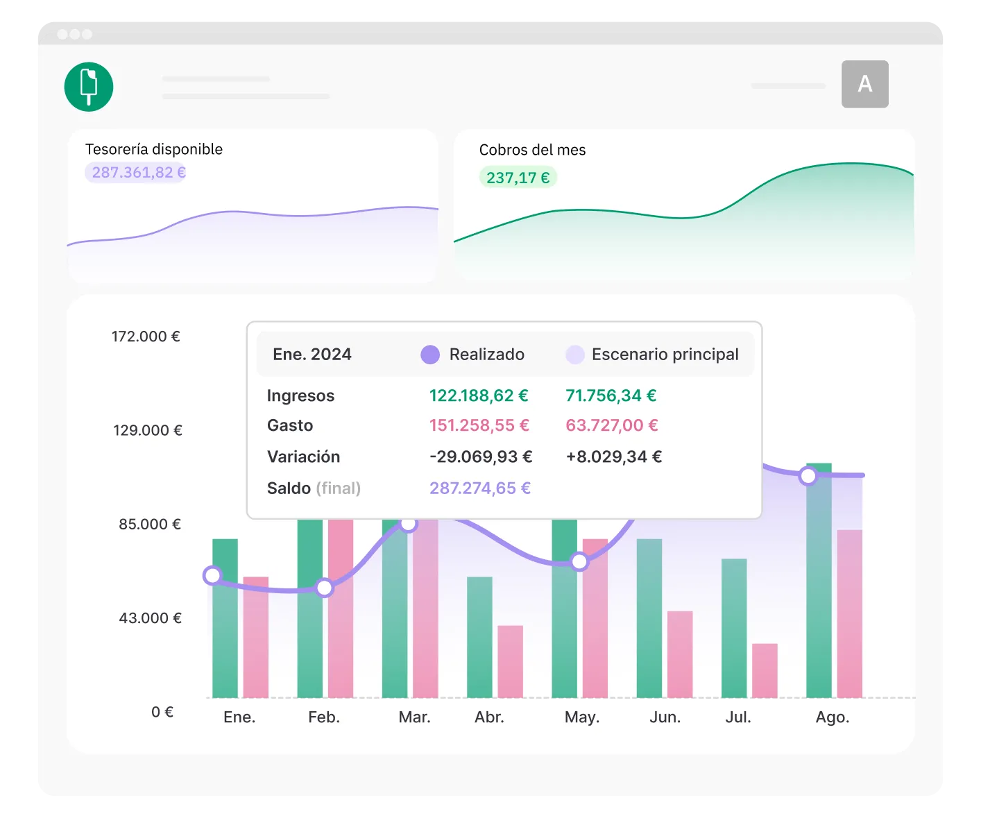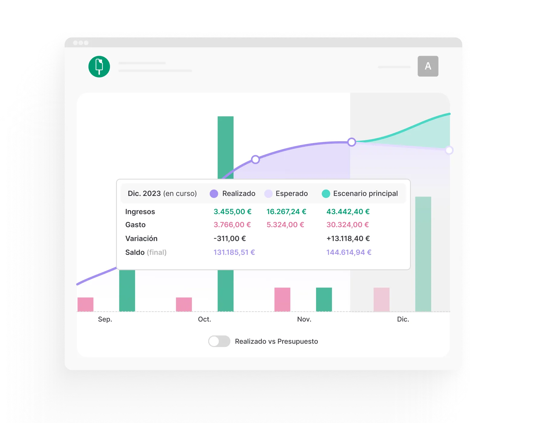 Compara tus cobros y pagos reales con los esperados y realiza previsiones fiables en un gráfico dinámico e intuitivo.