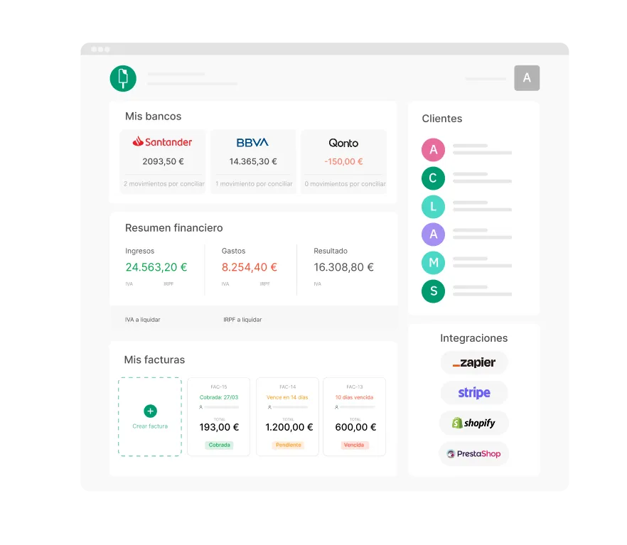 Todo lo que necesita tu negocio a un clic: factura, controla tus impuestos y gestiona tu actividad sin complicaciones.