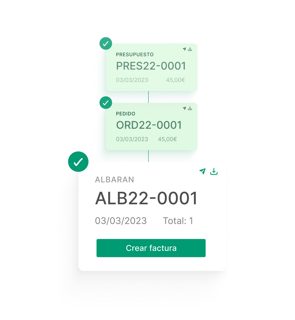 Crea presupuestos, pedidos y albaranes correlativos y conviértelos en facturas en 1 clic.